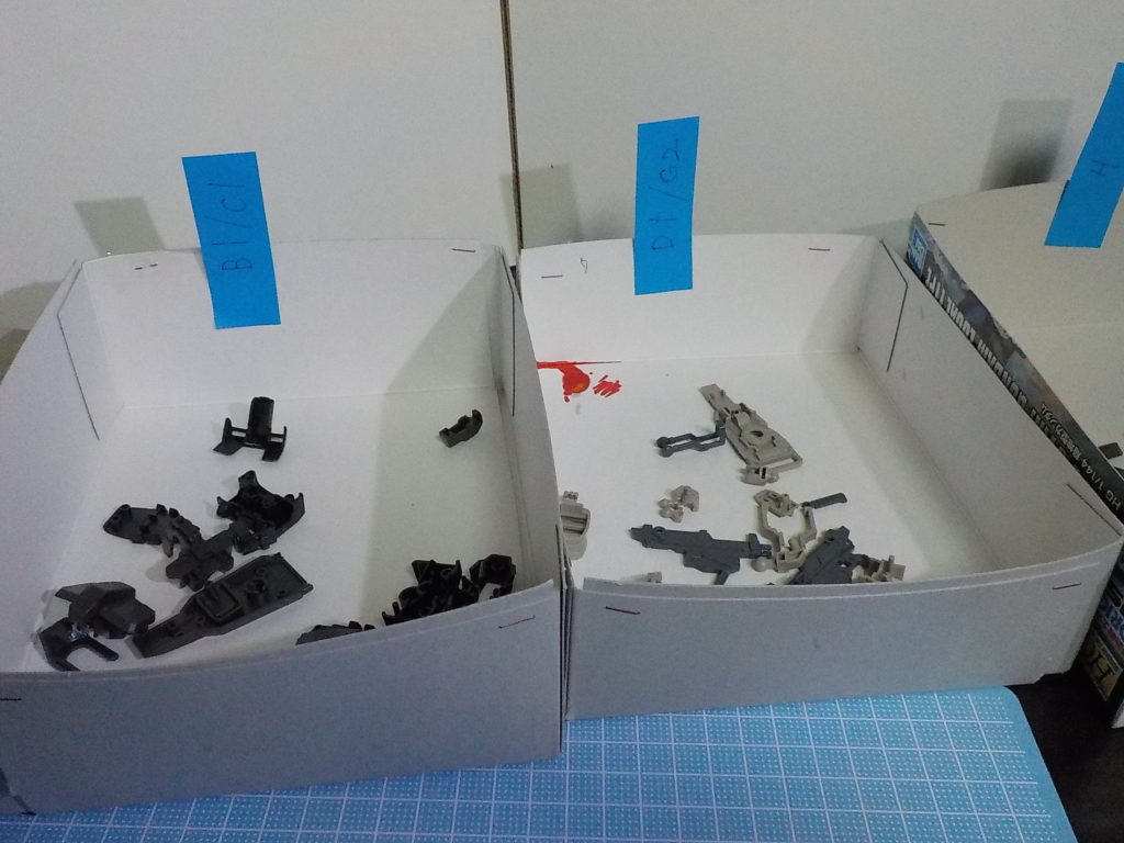HG元箱を半分に切ってホッチキスで止めただけの箱を4個用意。ランナー数が多いものはもっと多く用意。